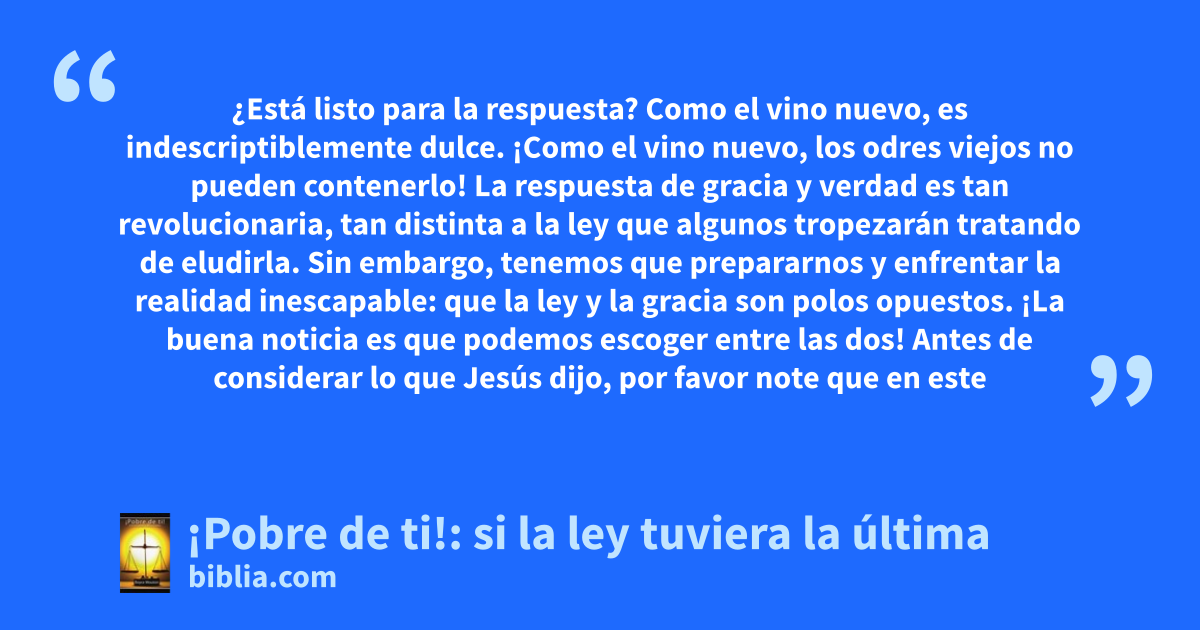 ¿Está listo para la respuesta? Como el vino nuevo, es indescriptiblemente dulce. ¡Como el vino nuevo, los odres viejos no pueden contenerlo! La respuesta de gracia y verdad es tan revolucionaria, tan distinta a la ley que algunos tropezarán tratando de eludirla. Sin embargo, tenemos que prepararnos y enfrentar la realidad inescapable: que la ley y la gracia son polos opuestos. ¡La buena noticia es que podemos escoger entre las dos! Antes de considerar lo que Jesús dijo, por favor note que en este