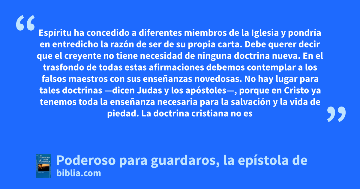 Espíritu ha concedido a diferentes miembros de la Iglesia y pondría en entredicho la razón de ser de su propia carta. Debe querer decir que el creyente no tiene necesidad de ninguna doctrina nueva. En el trasfondo de todas estas afirmaciones debemos contemplar a los falsos maestros con sus enseñanzas novedosas. No hay lugar para tales doctrinas —dicen Judas y los apóstoles—, porque en Cristo ya tenemos toda la enseñanza necesaria para la salvación y la vida de piedad. La doctrina cristiana no es