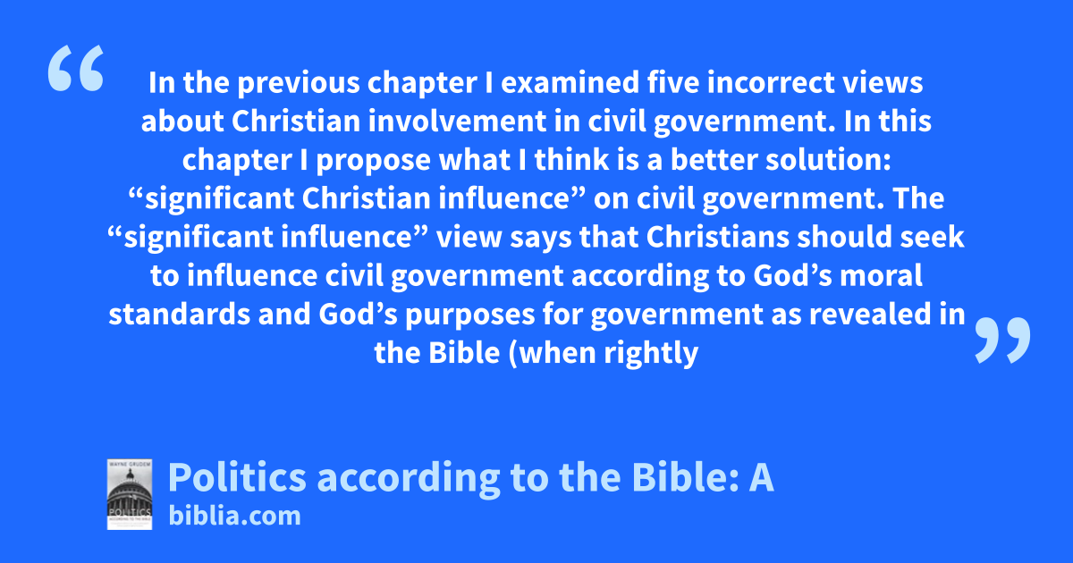 In the previous chapter I examined five incorrect views about Christian involvement in civil government. In this chapter I propose what I think is a better solution: “significant Christian influence” on civil government. The “significant influence” view says that Christians should seek to influence civil government according to God’s moral standards and God’s purposes for government as revealed in the Bible (when rightly
