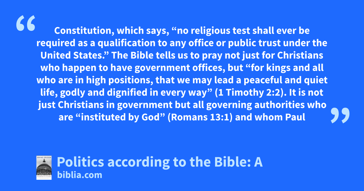 Constitution, which says, “no religious test shall ever be required as a qualification to any office or public trust under the United States.” The Bible tells us to pray not just for Christians who happen to have government offices, but “for kings and all who are in high positions, that we may lead a peaceful and quiet life, godly and dignified in every way” (1 Timothy 2:2). It is not just Christians in government but all governing authorities who are “instituted by God” (Romans 13:1) and whom Paul