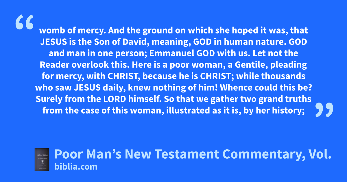 womb of mercy. And the ground on which she hoped it was, that JESUS is the Son of David, meaning, GOD in human nature. GOD and man in one person; Emmanuel GOD with us. Let not the Reader overlook this. Here is a poor woman, a Gentile, pleading for mercy, with CHRIST, because he is CHRIST; while thousands who saw JESUS daily, knew nothing of him! Whence could this be? Surely from the LORD himself. So that we gather two grand truths from the case of this woman, illustrated as it is, by her history;