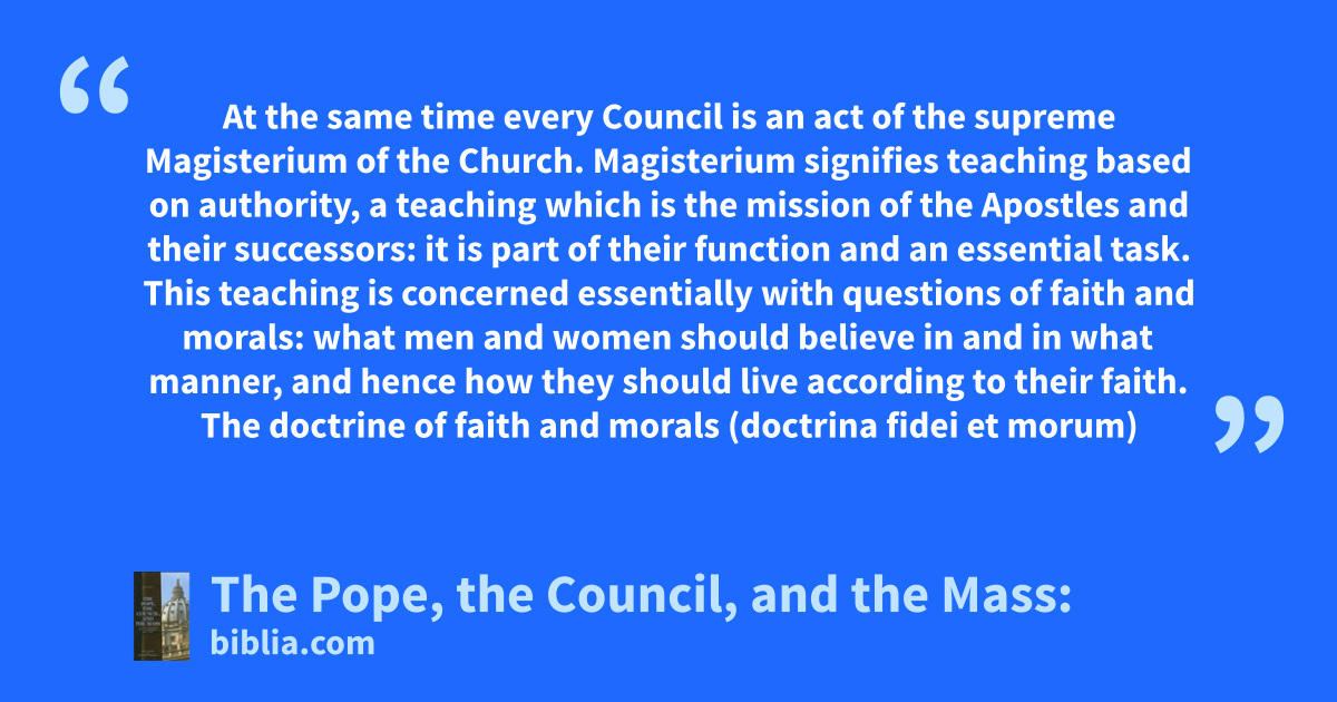 At the same time every Council is an act of the supreme Magisterium of the Church. Magisterium signifies teaching based on authority, a teaching which is the mission of the Apostles and their successors: it is part of their function and an essential task. This teaching is concerned essentially with questions of faith and morals: what men and women should believe in and in what manner, and hence how they should live according to their faith. The doctrine of faith and morals (doctrina fidei et morum)