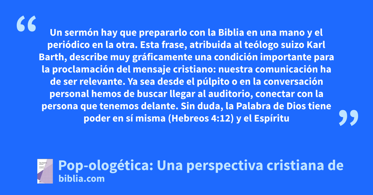 Un sermón hay que prepararlo con la Biblia en una mano y el periódico en la otra. Esta frase, atribuida al teólogo suizo Karl Barth, describe muy gráficamente una condición importante para la proclamación del mensaje cristiano: nuestra comunicación ha de ser relevante. Ya sea desde el púlpito o en la conversación personal hemos de buscar llegar al auditorio, conectar con la persona que tenemos delante. Sin duda, la Palabra de Dios tiene poder en sí misma (Hebreos 4:12) y el Espíritu