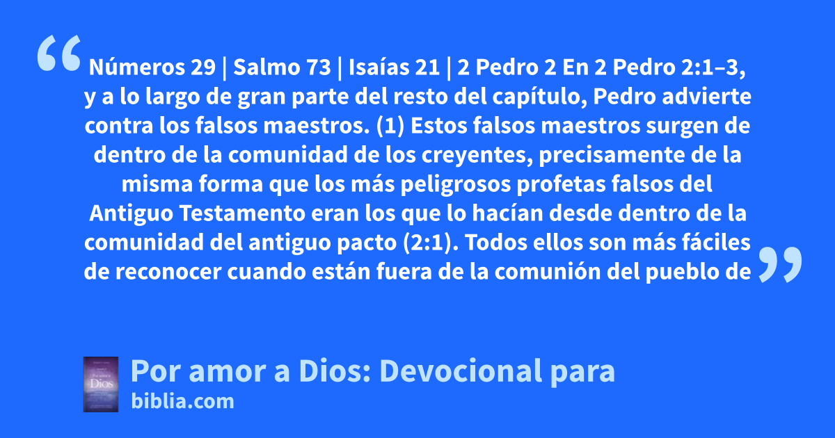 Números 29 | Salmo 73 | Isaías 21 | 2 Pedro 2 En 2 Pedro 2:1–3, y a lo largo de gran parte del resto del capítulo, Pedro advierte contra los falsos maestros. (1) Estos falsos maestros surgen de dentro de la comunidad de los creyentes, precisamente de la misma forma que los más peligrosos profetas falsos del Antiguo Testamento eran los que lo hacían desde dentro de la comunidad del antiguo pacto (2:1). Todos ellos son más fáciles de reconocer cuando están fuera de la comunión del pueblo de