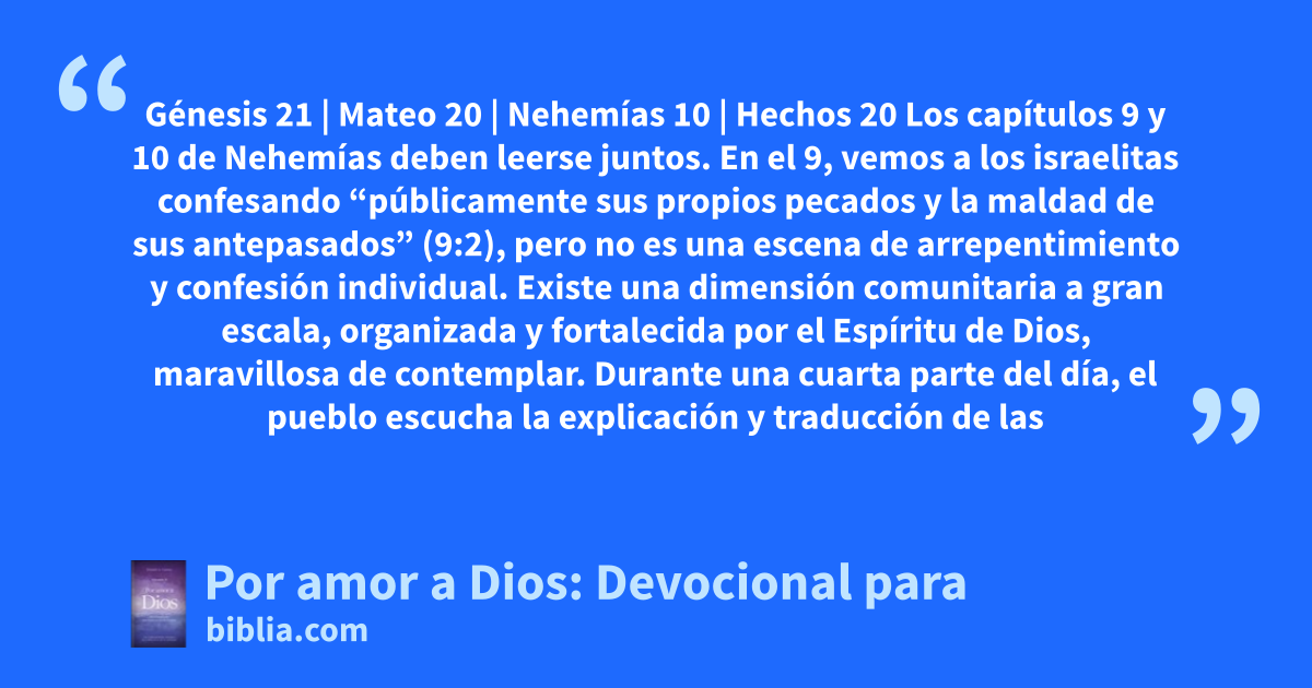 Génesis 21 | Mateo 20 | Nehemías 10 | Hechos 20 Los capítulos 9 y 10 de Nehemías deben leerse juntos. En el 9, vemos a los israelitas confesando “públicamente sus propios pecados y la maldad de sus antepasados” (9:2), pero no es una escena de arrepentimiento y confesión individual. Existe una dimensión comunitaria a gran escala, organizada y fortalecida por el Espíritu de Dios, maravillosa de contemplar. Durante una cuarta parte del día, el pueblo escucha la explicación y traducción de las