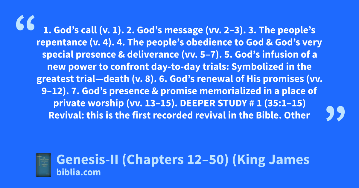 1. God’s call (v. 1). 2. God’s message (vv. 2–3). 3. The people’s repentance (v. 4). 4. The people’s obedience to God & God’s very special presence & deliverance (vv. 5–7). 5. God’s infusion of a new power to confront day-to-day trials: Symbolized in the greatest trial—death (v. 8). 6. God’s renewal of His promises (vv. 9–12). 7. God’s presence & promise memorialized in a place of private worship (vv. 13–15). DEEPER STUDY # 1 (35:1–15) Revival: this is the first recorded revival in the Bible. Other