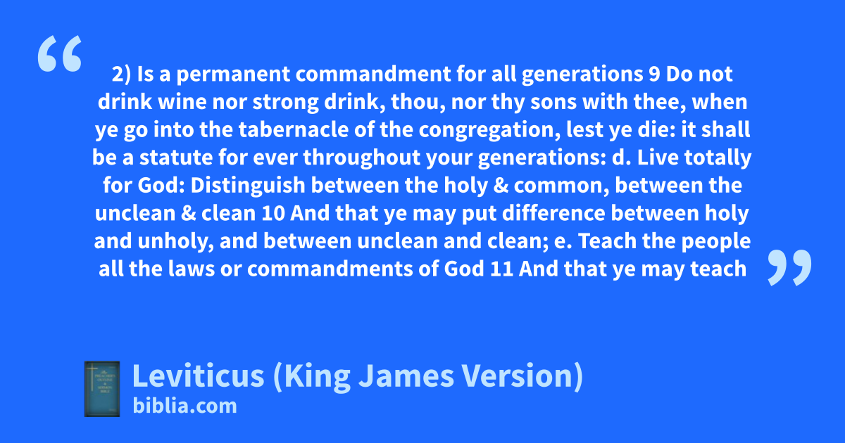 2) Is a permanent commandment for all generations 9 Do not drink wine nor strong drink, thou, nor thy sons with thee, when ye go into the tabernacle of the congregation, lest ye die: it shall be a statute for ever throughout your generations: d. Live totally for God: Distinguish between the holy & common, between the unclean & clean 10 And that ye may put difference between holy and unholy, and between unclean and clean; e. Teach the people all the laws or commandments of God 11 And that ye may teach