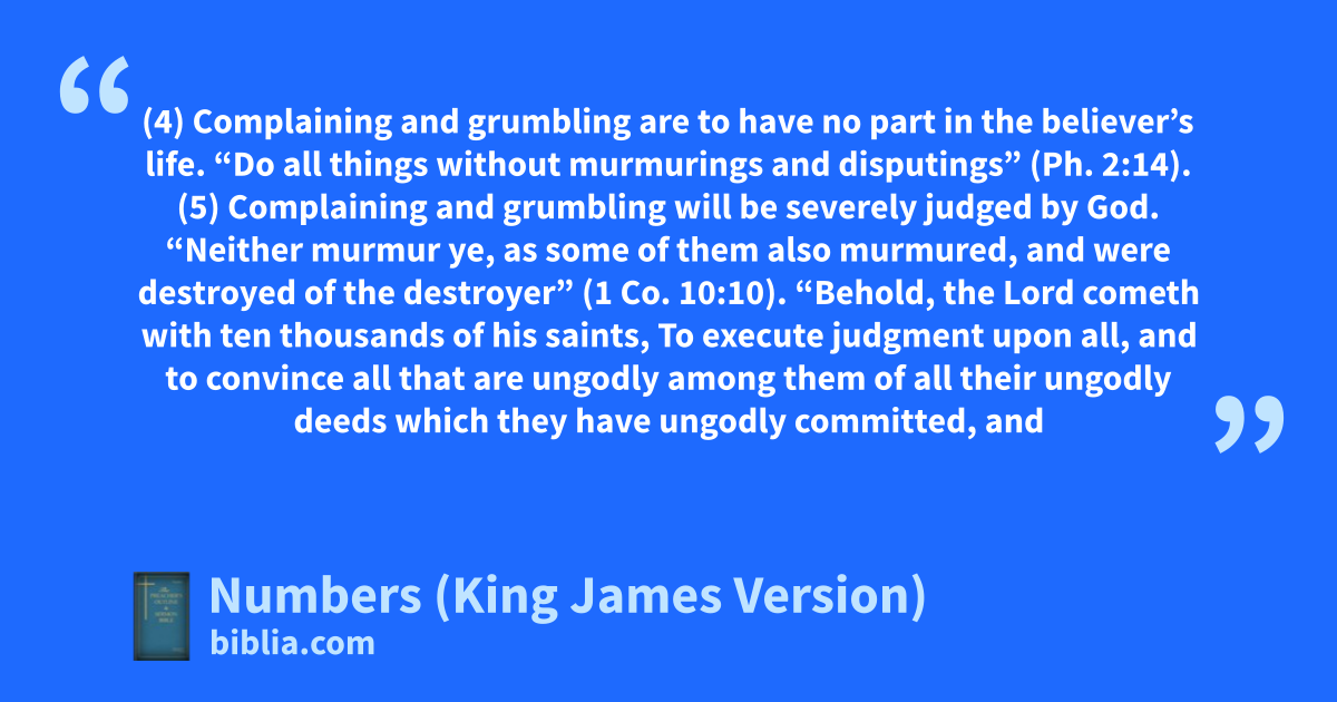 (4) Complaining and grumbling are to have no part in the believer’s life. “Do all things without murmurings and disputings” (Ph. 2:14). (5) Complaining and grumbling will be severely judged by God. “Neither murmur ye, as some of them also murmured, and were destroyed of the destroyer” (1 Co. 10:10). “Behold, the Lord cometh with ten thousands of his saints, To execute judgment upon all, and to convince all that are ungodly among them of all their ungodly deeds which they have ungodly committed, and