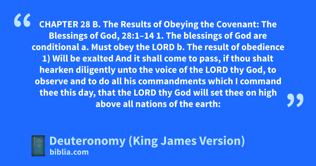 CHAPTER 28 B. The Results of Obeying the Covenant: The Blessings of God, 28:1–14 1. The blessings of God are conditional a. Must obey the LORD b. The result of obedience 1) Will be exalted And it shall come to pass, if thou shalt hearken diligently unto the voice of the LORD thy God, to observe and to do all his commandments which I command thee this day, that the LORD thy God will set thee on high above all nations of the earth: