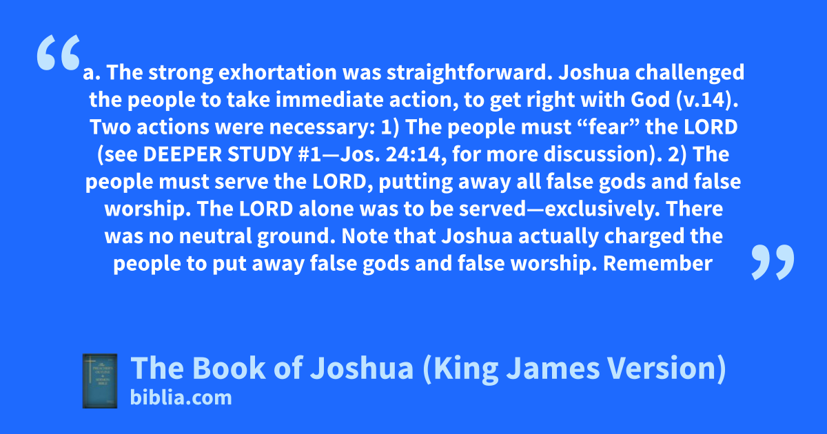 a. The strong exhortation was straightforward. Joshua challenged the people to take immediate action, to get right with God (v.14). Two actions were necessary: 1) The people must “fear” the LORD (see DEEPER STUDY #1—Jos. 24:14, for more discussion). 2) The people must serve the LORD, putting away all false gods and false worship. The LORD alone was to be served—exclusively. There was no neutral ground. Note that Joshua actually charged the people to put away false gods and false worship. Remember