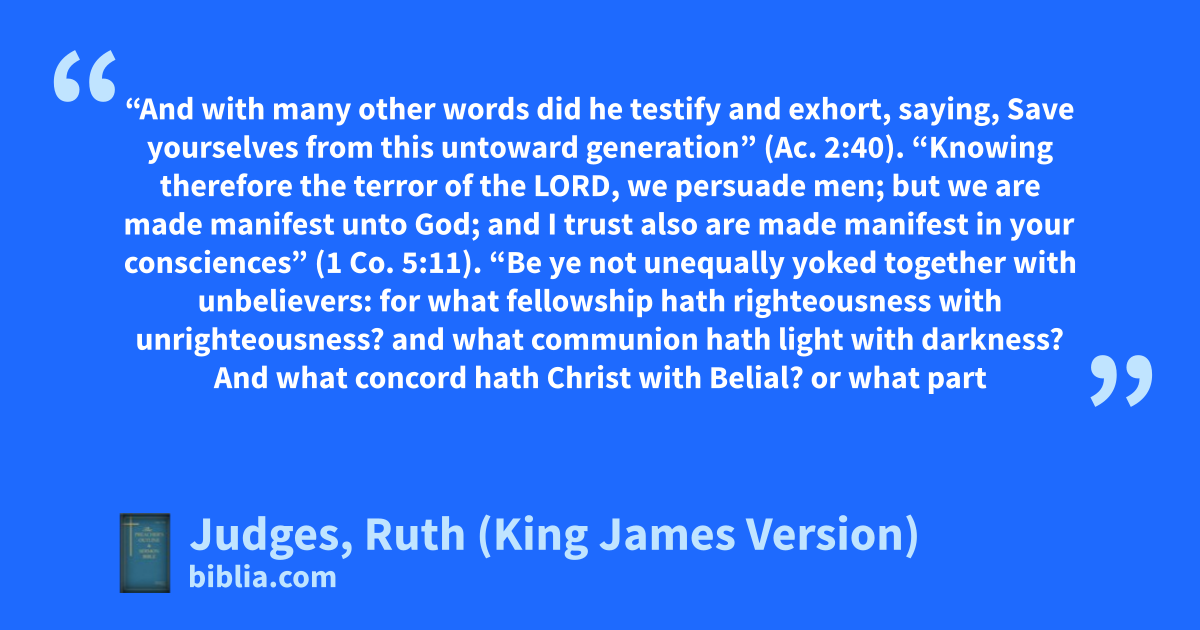 “And with many other words did he testify and exhort, saying, Save yourselves from this untoward generation” (Ac. 2:40). “Knowing therefore the terror of the LORD, we persuade men; but we are made manifest unto God; and I trust also are made manifest in your consciences” (1 Co. 5:11). “Be ye not unequally yoked together with unbelievers: for what fellowship hath righteousness with unrighteousness? and what communion hath light with darkness? And what concord hath Christ with Belial? or what part