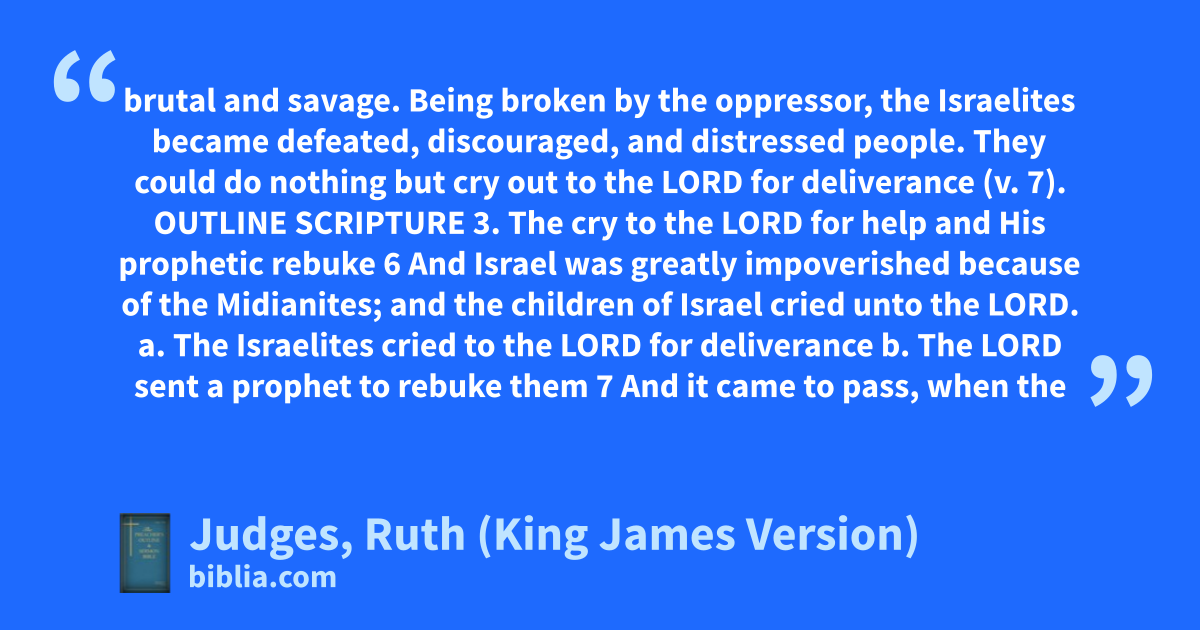 brutal and savage. Being broken by the oppressor, the Israelites became defeated, discouraged, and distressed people. They could do nothing but cry out to the LORD for deliverance (v. 7). OUTLINE SCRIPTURE 3. The cry to the LORD for help and His prophetic rebuke 6 And Israel was greatly impoverished because of the Midianites; and the children of Israel cried unto the LORD. a. The Israelites cried to the LORD for deliverance b. The LORD sent a prophet to rebuke them 7 And it came to pass, when the