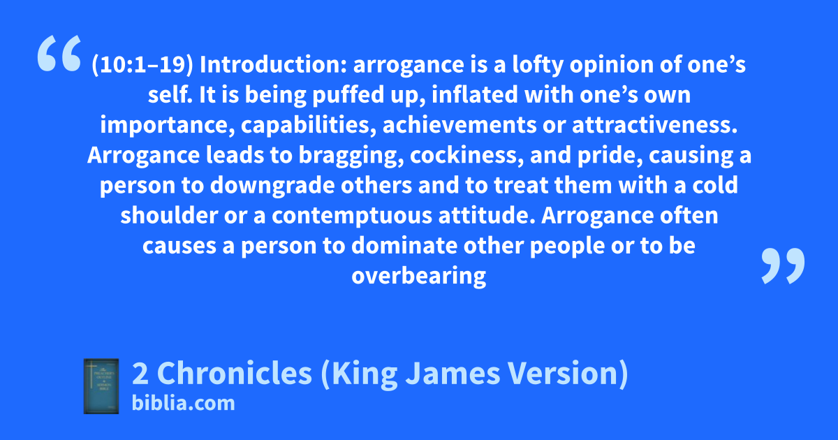 (10:1–19) Introduction: arrogance is a lofty opinion of one’s self. It is being puffed up, inflated with one’s own importance, capabilities, achievements or attractiveness. Arrogance leads to bragging, cockiness, and pride, causing a person to downgrade others and to treat them with a cold shoulder or a contemptuous attitude. Arrogance often causes a person to dominate other people or to be overbearing