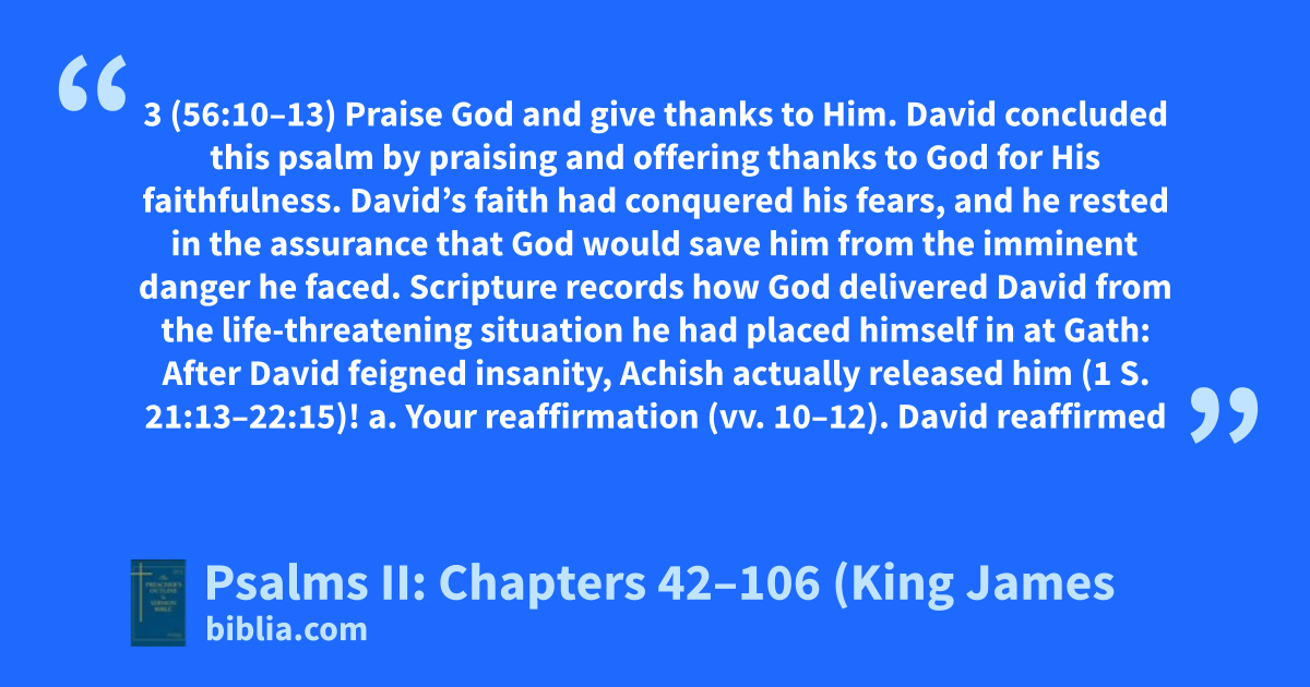 3 (56:10–13) Praise God and give thanks to Him. David concluded this psalm by praising and offering thanks to God for His faithfulness. David’s faith had conquered his fears, and he rested in the assurance that God would save him from the imminent danger he faced. Scripture records how God delivered David from the life-threatening situation he had placed himself in at Gath: After David feigned insanity, Achish actually released him (1 S. 21:13–22:15)! a. Your reaffirmation (vv. 10–12). David reaffirmed