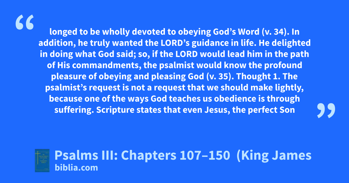 longed to be wholly devoted to obeying God’s Word (v. 34). In addition, he truly wanted the LORD’s guidance in life. He delighted in doing what God said; so, if the LORD would lead him in the path of His commandments, the psalmist would know the profound pleasure of obeying and pleasing God (v. 35). Thought 1. The psalmist’s request is not a request that we should make lightly, because one of the ways God teaches us obedience is through suffering. Scripture states that even Jesus, the perfect Son