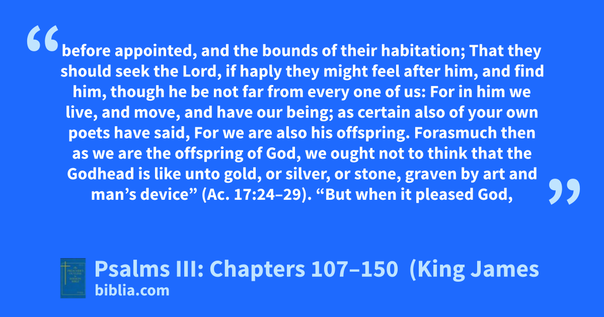 before appointed, and the bounds of their habitation; That they should seek the Lord, if haply they might feel after him, and find him, though he be not far from every one of us: For in him we live, and move, and have our being; as certain also of your own poets have said, For we are also his offspring. Forasmuch then as we are the offspring of God, we ought not to think that the Godhead is like unto gold, or silver, or stone, graven by art and man’s device” (Ac. 17:24–29). “But when it pleased God,