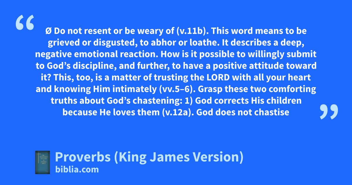 Ø Do not resent or be weary of (v.11b). This word means to be grieved or disgusted, to abhor or loathe. It describes a deep, negative emotional reaction. How is it possible to willingly submit to God’s discipline, and further, to have a positive attitude toward it? This, too, is a matter of trusting the LORD with all your heart and knowing Him intimately (vv.5–6). Grasp these two comforting truths about God’s chastening: 1) God corrects His children because He loves them (v.12a). God does not chastise