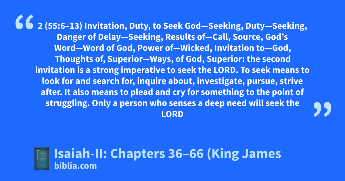 2 (55:6–13) Invitation, Duty, to Seek God—Seeking, Duty—Seeking, Danger of Delay—Seeking, Results of—Call, Source, God’s Word—Word of God, Power of—Wicked, Invitation to—God, Thoughts of, Superior—Ways, of God, Superior: the second invitation is a strong imperative to seek the LORD. To seek means to look for and search for, inquire about, investigate, pursue, strive after. It also means to plead and cry for something to the point of struggling. Only a person who senses a deep need will seek the LORD