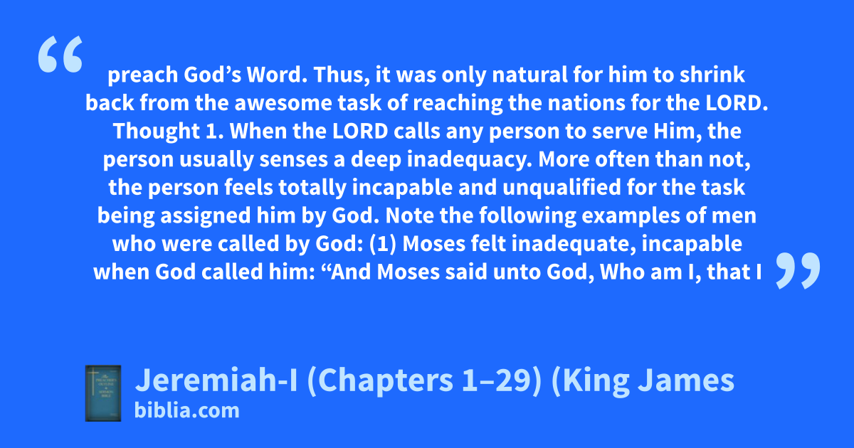 preach God’s Word. Thus, it was only natural for him to shrink back from the awesome task of reaching the nations for the LORD. Thought 1. When the LORD calls any person to serve Him, the person usually senses a deep inadequacy. More often than not, the person feels totally incapable and unqualified for the task being assigned him by God. Note the following examples of men who were called by God: (1) Moses felt inadequate, incapable when God called him: “And Moses said unto God, Who am I, that I