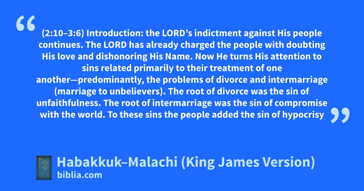 (2:10–3:6) Introduction: the LORD’s indictment against His people continues. The LORD has already charged the people with doubting His love and dishonoring His Name. Now He turns His attention to sins related primarily to their treatment of one another—predominantly, the problems of divorce and intermarriage (marriage to unbelievers). The root of divorce was the sin of unfaithfulness. The root of intermarriage was the sin of compromise with the world. To these sins the people added the sin of hypocrisy
