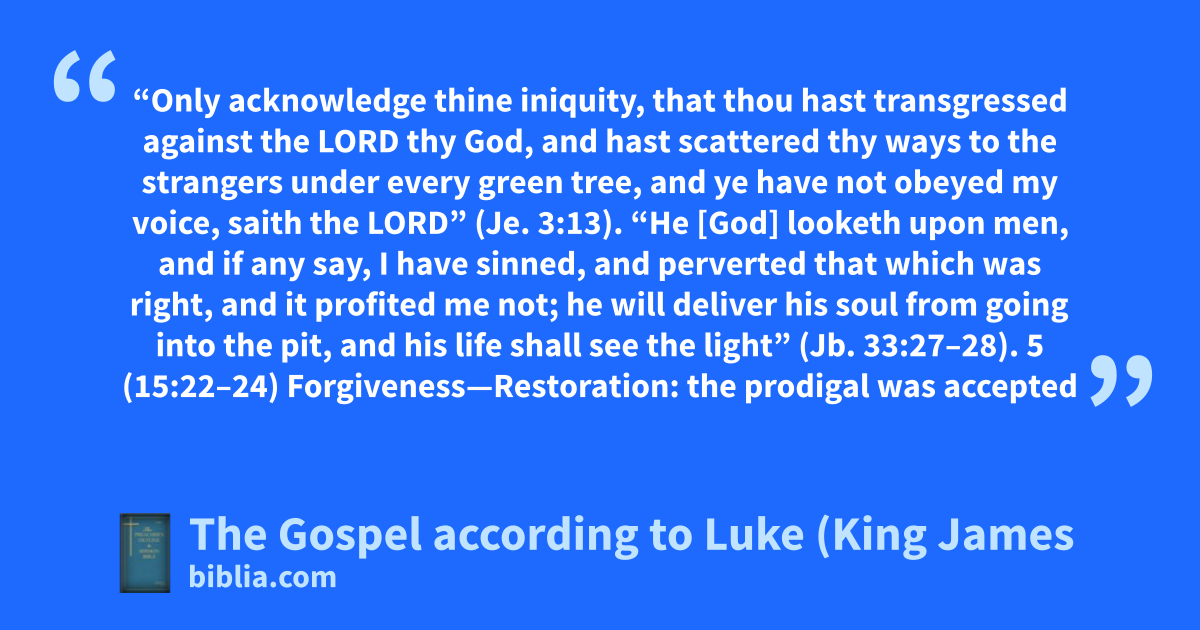 “Only acknowledge thine iniquity, that thou hast transgressed against the LORD thy God, and hast scattered thy ways to the strangers under every green tree, and ye have not obeyed my voice, saith the LORD” (Je. 3:13). “He [God] looketh upon men, and if any say, I have sinned, and perverted that which was right, and it profited me not; he will deliver his soul from going into the pit, and his life shall see the light” (Jb. 33:27–28). 5 (15:22–24) Forgiveness—Restoration: the prodigal was accepted