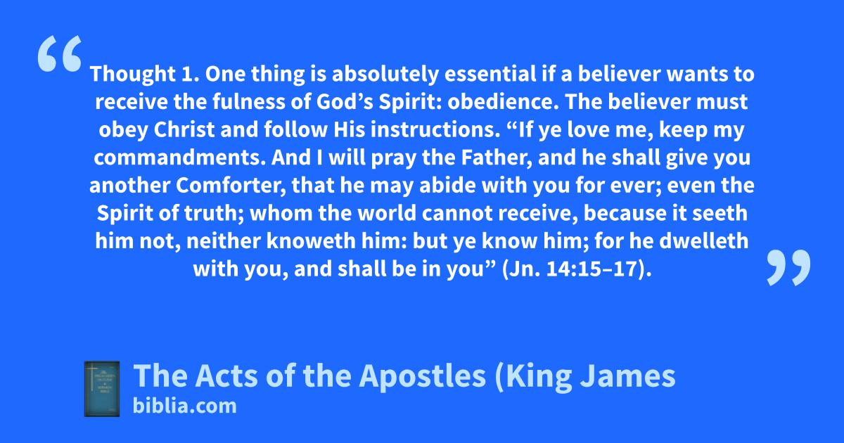 Thought 1. One thing is absolutely essential if a believer wants to receive the fulness of God’s Spirit: obedience. The believer must obey Christ and follow His instructions. “If ye love me, keep my commandments. And I will pray the Father, and he shall give you another Comforter, that he may abide with you for ever; even the Spirit of truth; whom the world cannot receive, because it seeth him not, neither knoweth him: but ye know him; for he dwelleth with you, and shall be in you” (Jn. 14:15–17).