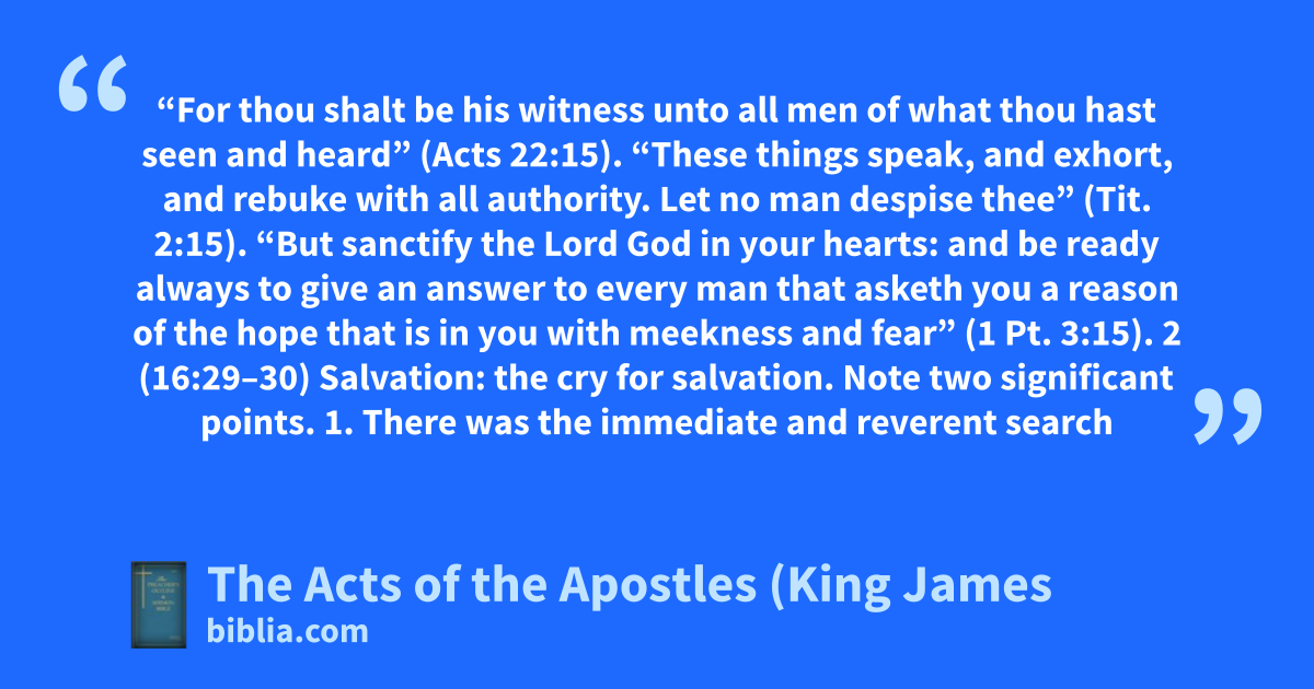 “For thou shalt be his witness unto all men of what thou hast seen and heard” (Acts 22:15). “These things speak, and exhort, and rebuke with all authority. Let no man despise thee” (Tit. 2:15). “But sanctify the Lord God in your hearts: and be ready always to give an answer to every man that asketh you a reason of the hope that is in you with meekness and fear” (1 Pt. 3:15). 2 (16:29–30) Salvation: the cry for salvation. Note two significant points. 1. There was the immediate and reverent search