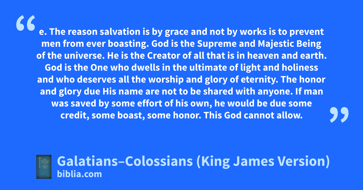 e. The reason salvation is by grace and not by works is to prevent men from ever boasting. God is the Supreme and Majestic Being of the universe. He is the Creator of all that is in heaven and earth. God is the One who dwells in the ultimate of light and holiness and who deserves all the worship and glory of eternity. The honor and glory due His name are not to be shared with anyone. If man was saved by some effort of his own, he would be due some credit, some boast, some honor. This God cannot allow.