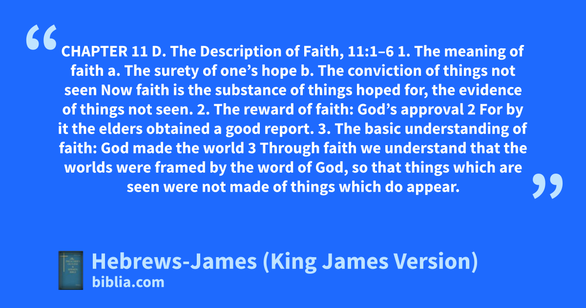 CHAPTER 11 D. The Description of Faith, 11:1–6 1. The meaning of faith a. The surety of one’s hope b. The conviction of things not seen Now faith is the substance of things hoped for, the evidence of things not seen. 2. The reward of faith: God’s approval 2 For by it the elders obtained a good report. 3. The basic understanding of faith: God made the world 3 Through faith we understand that the worlds were framed by the word of God, so that things which are seen were not made of things which do appear.