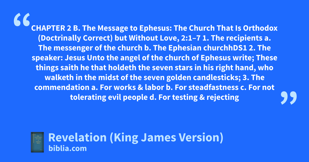 CHAPTER 2 B. The Message to Ephesus: The Church That Is Orthodox (Doctrinally Correct) but Without Love, 2:1–7 1. The recipients a. The messenger of the church b. The Ephesian churchhDS1 2. The speaker: Jesus Unto the angel of the church of Ephesus write; These things saith he that holdeth the seven stars in his right hand, who walketh in the midst of the seven golden candlesticks; 3. The commendation a. For works & labor b. For steadfastness c. For not tolerating evil people d. For testing & rejecting