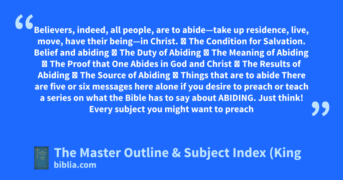 Believers, indeed, all people, are to abide—take up residence, live, move, have their being—in Christ. ➢ The Condition for Salvation. Belief and abiding ➢ The Duty of Abiding ➢ The Meaning of Abiding ➢ The Proof that One Abides in God and Christ ➢ The Results of Abiding ➢ The Source of Abiding ➢ Things that are to abide There are five or six messages here alone if you desire to preach or teach a series on what the Bible has to say about ABIDING. Just think! Every subject you might want to preach