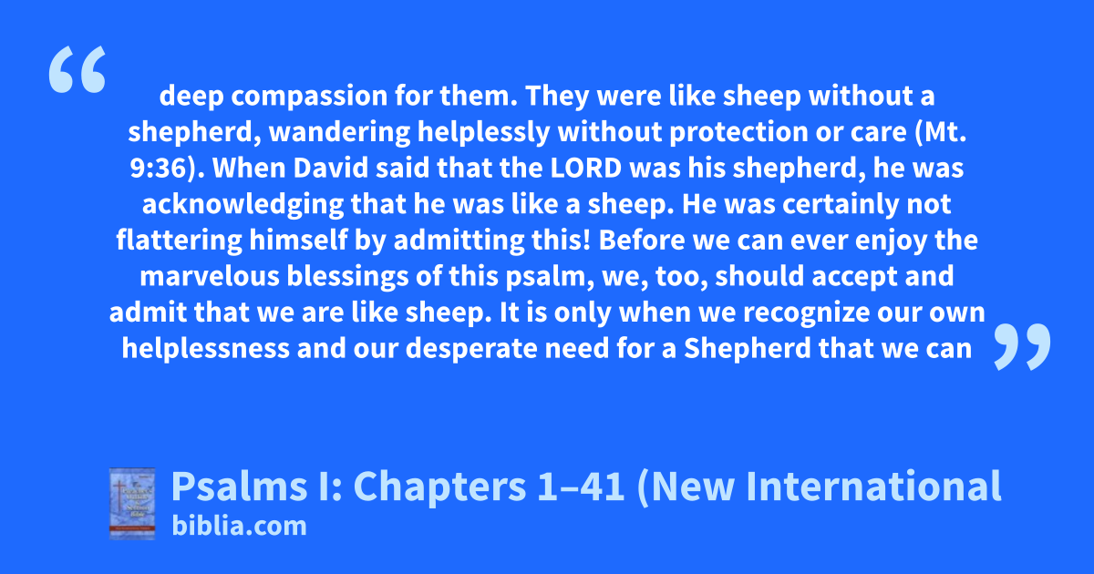 deep compassion for them. They were like sheep without a shepherd, wandering helplessly without protection or care (Mt. 9:36). When David said that the LORD was his shepherd, he was acknowledging that he was like a sheep. He was certainly not flattering himself by admitting this! Before we can ever enjoy the marvelous blessings of this psalm, we, too, should accept and admit that we are like sheep. It is only when we recognize our own helplessness and our desperate need for a Shepherd that we can