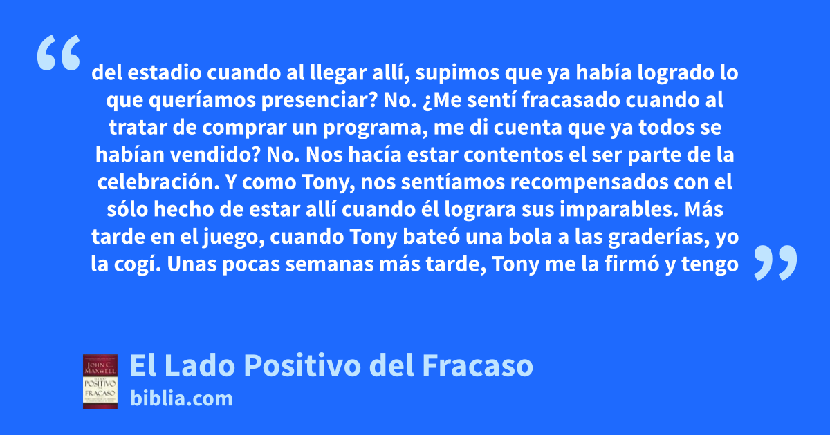 del estadio cuando al llegar allí, supimos que ya había logrado lo que queríamos presenciar? No. ¿Me sentí fracasado cuando al tratar de comprar un programa, me di cuenta que ya todos se habían vendido? No. Nos hacía estar contentos el ser parte de la celebración. Y como Tony, nos sentíamos recompensados con el sólo hecho de estar allí cuando él lograra sus imparables. Más tarde en el juego, cuando Tony bateó una bola a las graderías, yo la cogí. Unas pocas semanas más tarde, Tony me la firmó y tengo