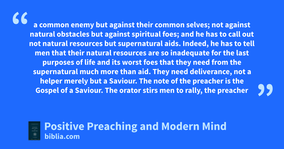 a common enemy but against their common selves; not against natural obstacles but against spiritual foes; and he has to call out not natural resources but supernatural aids. Indeed, he has to tell men that their natural resources are so inadequate for the last purposes of life and its worst foes that they need from the supernatural much more than aid. They need deliverance, not a helper merely but a Saviour. The note of the preacher is the Gospel of a Saviour. The orator stirs men to rally, the preacher
