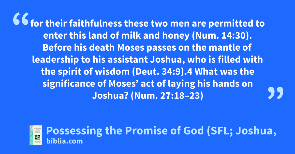 for their faithfulness these two men are permitted to enter this land of milk and honey (Num. 14:30). Before his death Moses passes on the mantle of leadership to his assistant Joshua, who is filled with the spirit of wisdom (Deut. 34:9).4 What was the significance of Moses’ act of laying his hands on Joshua? (Num. 27:18–23)