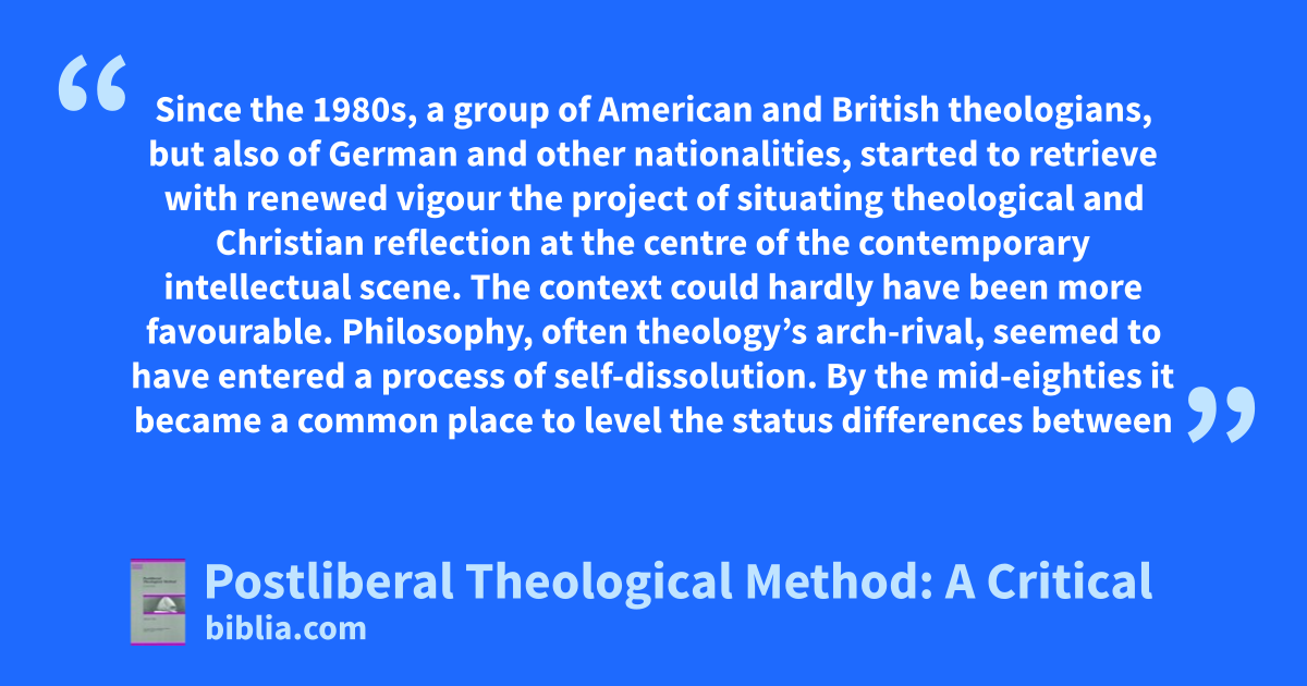 Since the 1980s, a group of American and British theologians, but also of German and other nationalities, started to retrieve with renewed vigour the project of situating theological and Christian reflection at the centre of the contemporary intellectual scene. The context could hardly have been more favourable. Philosophy, often theology’s arch-rival, seemed to have entered a process of self-dissolution. By the mid-eighties it became a common place to level the status differences between