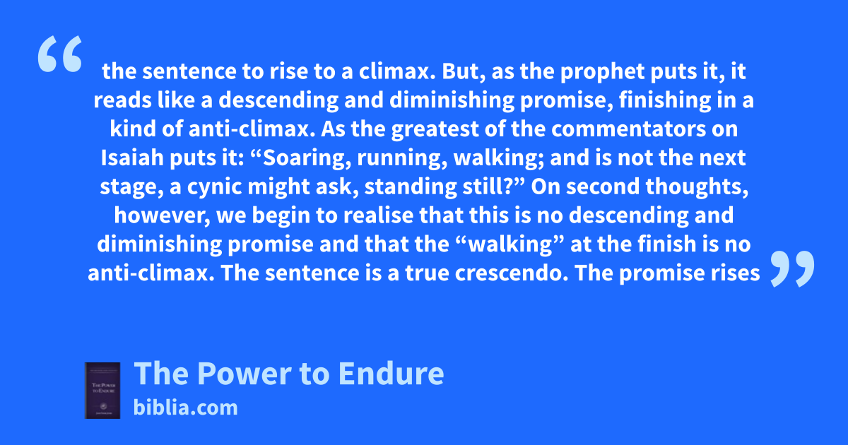 the sentence to rise to a climax. But, as the prophet puts it, it reads like a descending and diminishing promise, finishing in a kind of anti-climax. As the greatest of the commentators on Isaiah puts it: “Soaring, running, walking; and is not the next stage, a cynic might ask, standing still?” On second thoughts, however, we begin to realise that this is no descending and diminishing promise and that the “walking” at the finish is no anti-climax. The sentence is a true crescendo. The promise rises