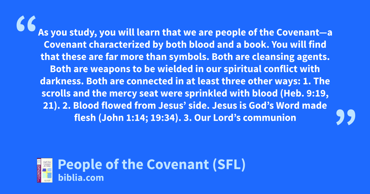 As you study, you will learn that we are people of the Covenant—a Covenant characterized by both blood and a book. You will find that these are far more than symbols. Both are cleansing agents. Both are weapons to be wielded in our spiritual conflict with darkness. Both are connected in at least three other ways: 1. The scrolls and the mercy seat were sprinkled with blood (Heb. 9:19, 21). 2. Blood flowed from Jesus’ side. Jesus is God’s Word made flesh (John 1:14; 19:34). 3. Our Lord’s communion
