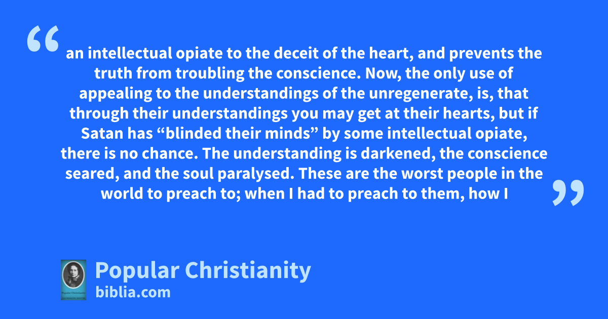 an intellectual opiate to the deceit of the heart, and prevents the truth from troubling the conscience. Now, the only use of appealing to the understandings of the unregenerate, is, that through their understandings you may get at their hearts, but if Satan has “blinded their minds” by some intellectual opiate, there is no chance. The understanding is darkened, the conscience seared, and the soul paralysed. These are the worst people in the world to preach to; when I had to preach to them, how I