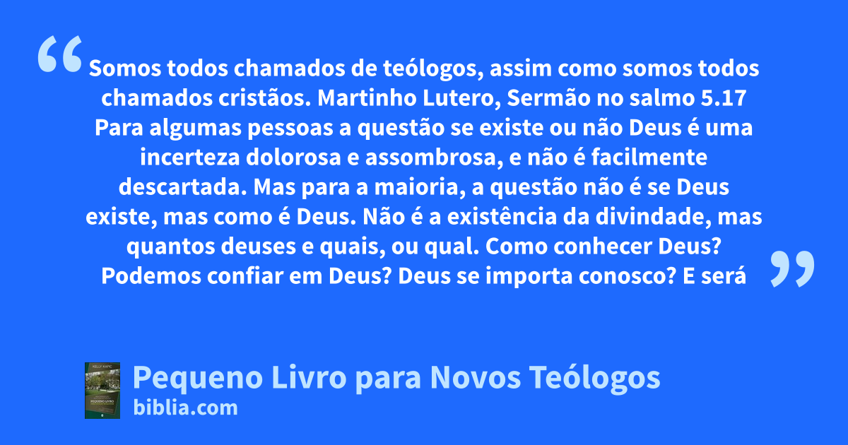 Somos todos chamados de teólogos, assim como somos todos chamados cristãos. Martinho Lutero, Sermão no salmo 5.17 Para algumas pessoas a questão se existe ou não Deus é uma incerteza dolorosa e assombrosa, e não é facilmente descartada. Mas para a maioria, a questão não é se Deus existe, mas como é Deus. Não é a existência da divindade, mas quantos deuses e quais, ou qual. Como conhecer Deus? Podemos confiar em Deus? Deus se importa conosco? E será