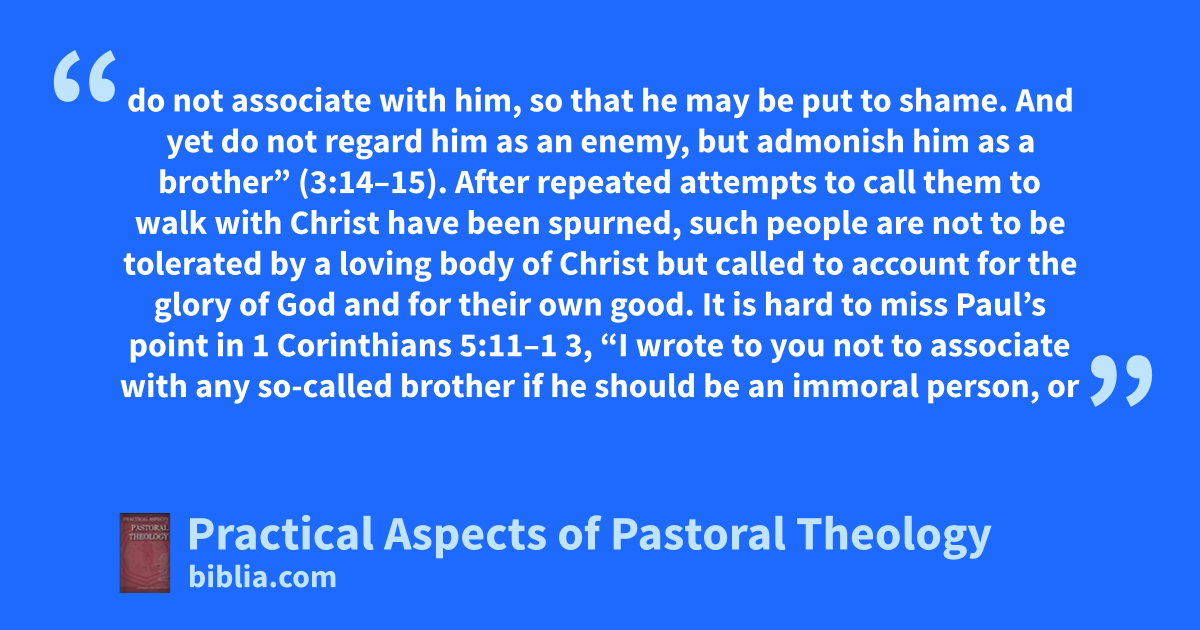 do not associate with him, so that he may be put to shame. And yet do not regard him as an enemy, but admonish him as a brother” (3:14–15). After repeated attempts to call them to walk with Christ have been spurned, such people are not to be tolerated by a loving body of Christ but called to account for the glory of God and for their own good. It is hard to miss Paul’s point in 1 Corinthians 5:11–1 3, “I wrote to you not to associate with any so-called brother if he should be an immoral person, or
