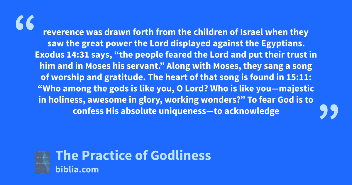 reverence was drawn forth from the children of Israel when they saw the great power the Lord displayed against the Egyptians. Exodus 14:31 says, “the people feared the Lord and put their trust in him and in Moses his servant.” Along with Moses, they sang a song of worship and gratitude. The heart of that song is found in 15:11: “Who among the gods is like you, O Lord? Who is like you—majestic in holiness, awesome in glory, working wonders?” To fear God is to confess His absolute uniqueness—to acknowledge