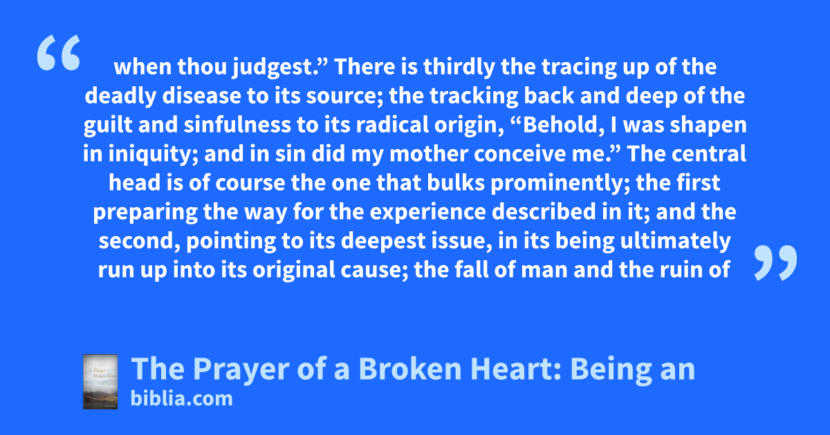 when thou judgest.” There is thirdly the tracing up of the deadly disease to its source; the tracking back and deep of the guilt and sinfulness to its radical origin, “Behold, I was shapen in iniquity; and in sin did my mother conceive me.” The central head is of course the one that bulks prominently; the first preparing the way for the experience described in it; and the second, pointing to its deepest issue, in its being ultimately run up into its original cause; the fall of man and the ruin of