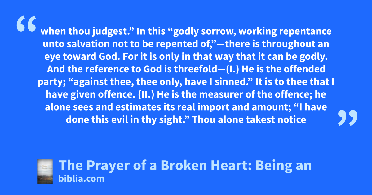 when thou judgest.” In this “godly sorrow, working repentance unto salvation not to be repented of,”—there is throughout an eye toward God. For it is only in that way that it can be godly. And the reference to God is threefold—(I.) He is the offended party; “against thee, thee only, have I sinned.” It is to thee that I have given offence. (II.) He is the measurer of the offence; he alone sees and estimates its real import and amount; “I have done this evil in thy sight.” Thou alone takest notice