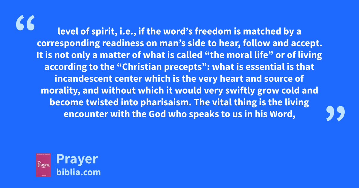 level of spirit, i.e., if the word’s freedom is matched by a corresponding readiness on man’s side to hear, follow and accept. It is not only a matter of what is called “the moral life” or of living according to the “Christian precepts”: what is essential is that incandescent center which is the very heart and source of morality, and without which it would very swiftly grow cold and become twisted into pharisaism. The vital thing is the living encounter with the God who speaks to us in his Word,