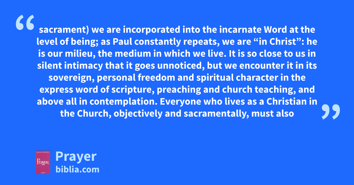 sacrament) we are incorporated into the incarnate Word at the level of being; as Paul constantly repeats, we are “in Christ”: he is our milieu, the medium in which we live. It is so close to us in silent intimacy that it goes unnoticed, but we encounter it in its sovereign, personal freedom and spiritual character in the express word of scripture, preaching and church teaching, and above all in contemplation. Everyone who lives as a Christian in the Church, objectively and sacramentally, must also