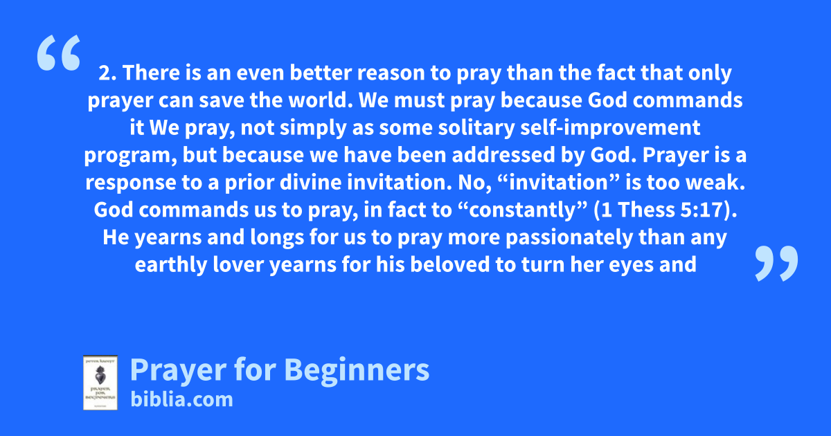2. There is an even better reason to pray than the fact that only prayer can save the world. We must pray because God commands it We pray, not simply as some solitary self-improvement program, but because we have been addressed by God. Prayer is a response to a prior divine invitation. No, “invitation” is too weak. God commands us to pray, in fact to “constantly” (1 Thess 5:17). He yearns and longs for us to pray more passionately than any earthly lover yearns for his beloved to turn her eyes and