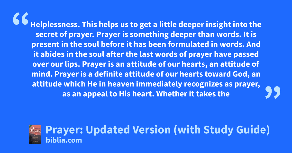 Helplessness. This helps us to get a little deeper insight into the secret of prayer. Prayer is something deeper than words. It is present in the soul before it has been formulated in words. And it abides in the soul after the last words of prayer have passed over our lips. Prayer is an attitude of our hearts, an attitude of mind. Prayer is a definite attitude of our hearts toward God, an attitude which He in heaven immediately recognizes as prayer, as an appeal to His heart. Whether it takes the