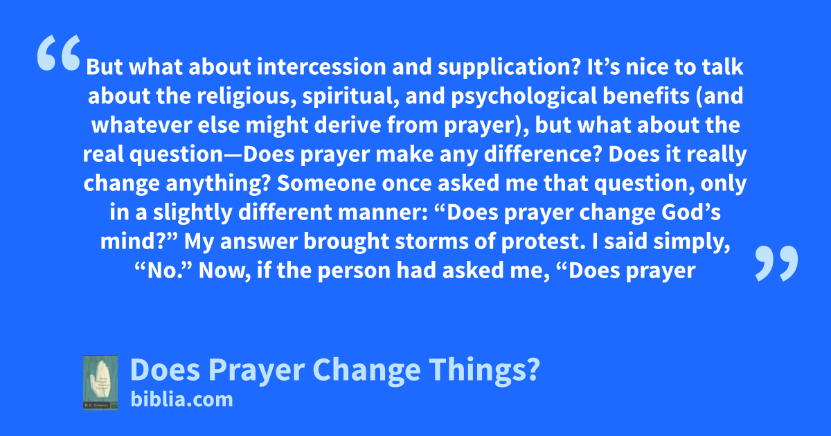 But what about intercession and supplication? It’s nice to talk about the religious, spiritual, and psychological benefits (and whatever else might derive from prayer), but what about the real question—Does prayer make any difference? Does it really change anything? Someone once asked me that question, only in a slightly different manner: “Does prayer change God’s mind?” My answer brought storms of protest. I said simply, “No.” Now, if the person had asked me, “Does prayer
