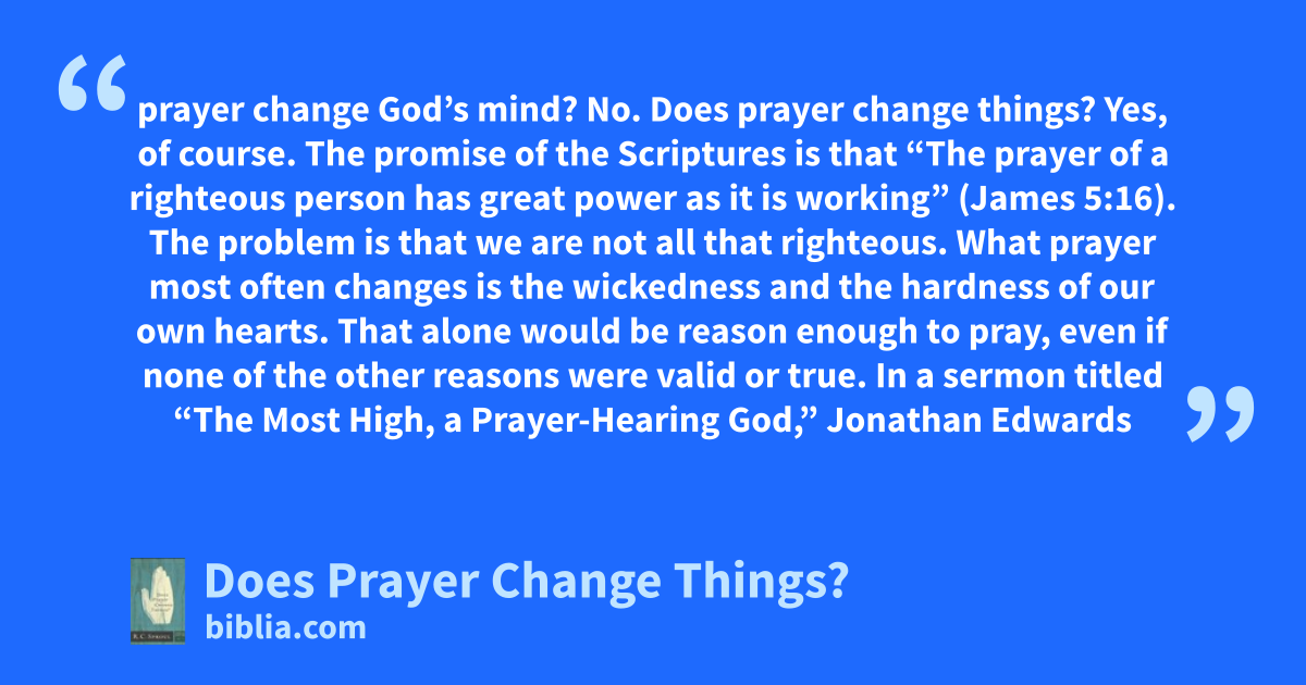 prayer change God’s mind? No. Does prayer change things? Yes, of course. The promise of the Scriptures is that “The prayer of a righteous person has great power as it is working” (James 5:16). The problem is that we are not all that righteous. What prayer most often changes is the wickedness and the hardness of our own hearts. That alone would be reason enough to pray, even if none of the other reasons were valid or true. In a sermon titled “The Most High, a Prayer-Hearing God,” Jonathan Edwards